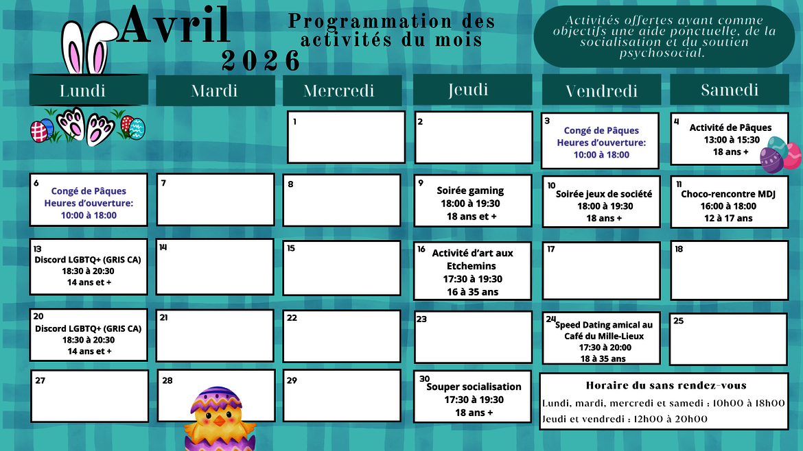 Bee you : 8 rencontres de groupe (groupe fermé), coanimées avec la travailleuse de rue Beauce-Sartigan, qui abordent différents thèmes afin d'améliorer sa connaissance de soi (12-17 ans).