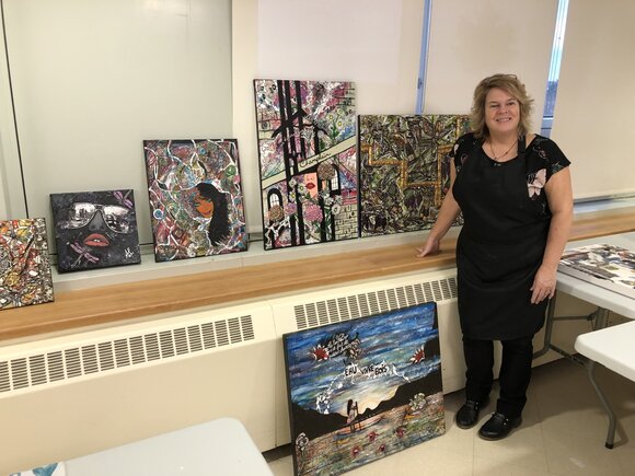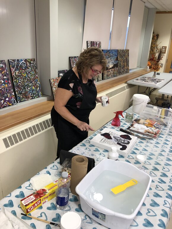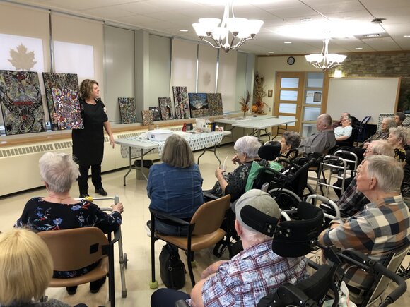 Mme Annie Lamontagne, artiste peintre de la région, est venue présenter bénévolement ses œuvres d’art au CHSLD. Lors de sa présentation, elle a procédé à la réalisation d’une toile permettant aux résidents et résidentes d’apprécier son talent et de voir les multiples techniques utilisées pour créer une toile. |