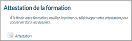 À la toute fin, uniquement après avoir terminé le visionnement de la totalité des activités composant la formation, il est possible d’obtenir une attestation. Pour ce faire, cliquez sur « Attestation »