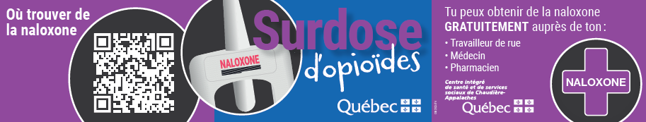 La naloxone pour contrer les surdoses aux opioïdes. Le site de l’INSPQ nous donne toute l’information sur l’administration de la naloxone injectable ou intranasale (en format intranasal dans quelques pharmacies et organisme à l’heure actuelle). Nous pouvons aussi y trouver la carte des endroits (pharmacies communautaires et quelques organismes) où on peut se procurer la naloxone GRATUITEMENT.