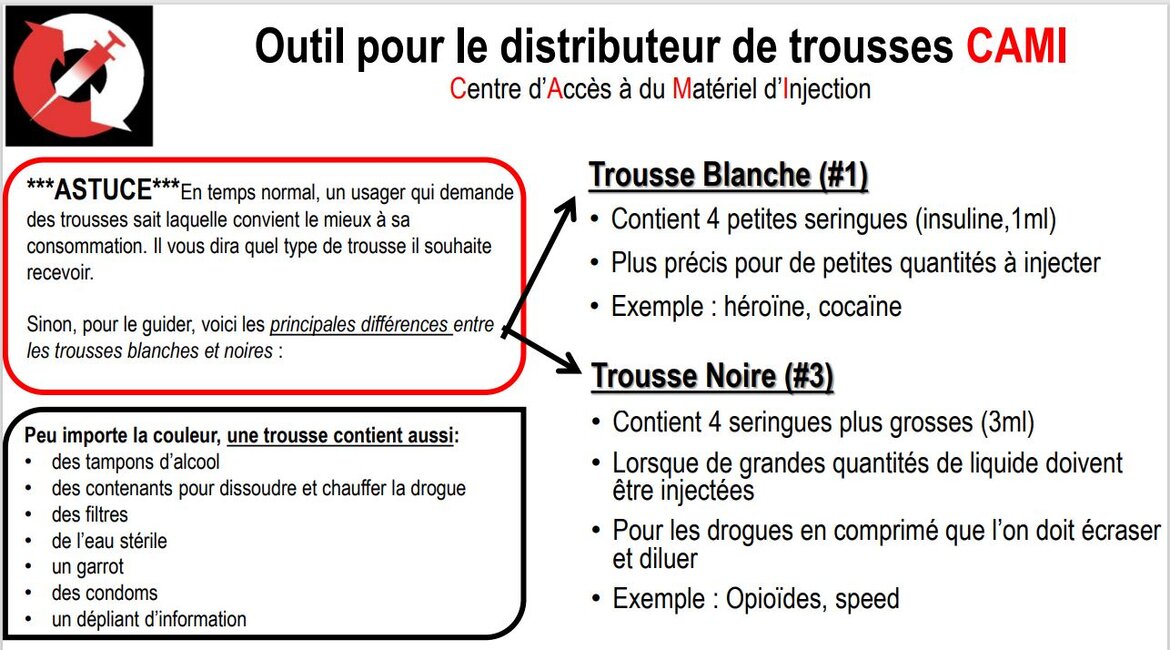 Les pharmacies, les CLSC, les hôpitaux et les organismes communautaires faisant partie du programme CAMI (Centre d’accès à du matériel d’injection) sont des endroits où les personnes qui consomment des drogues peuvent se procurer du matériel d’injection de façon gratuite et anonyme. La distribution de matériel d’injection neuf aux personnes qui consomment des drogues les aide à adopter des comportements plus sécuritaires. Ces personnes diminuent ainsi leur risque d’acquérir ou de transmettre des ITSS (VIH, hépatites B et C). La distribution de matériel d’injection neuf aux personnes qui consomment des drogues les aide à adopter des comportements plus sécuritaires. Ces personnes diminuent ainsi leur risque d’acquérir ou de transmettre des ITSS (VIH, hépatites B et C).