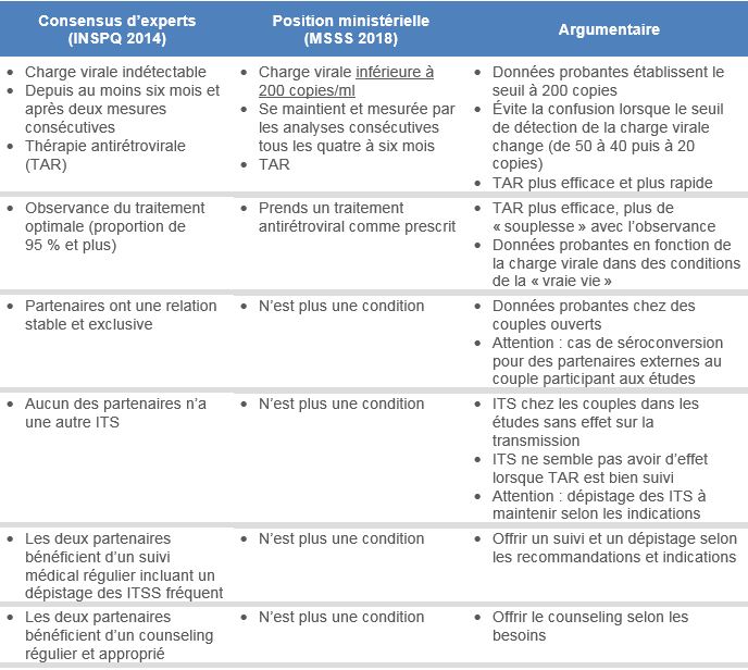 Cette position remplace les recommandations émises antérieurement dans l’avis Consensus d’experts : charge virale et risque de transmission du VIH, INSPQ, 2014. Ainsi, les conditions à respecter passent de 6 à 2.