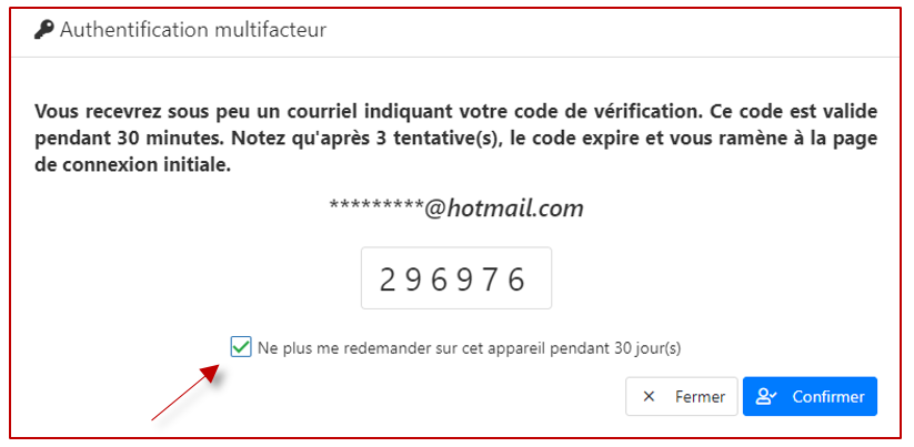 Il est possible de cocher la case « Ne plus me redemander sur cet appareil pendant 30 jours » lors de votre connexion.