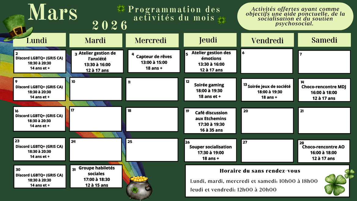 Bee you : 8 rencontres de groupe (groupe fermé), coanimées avec la travailleuse de rue Beauce-Sartigan, qui abordent différents thèmes afin d'améliorer sa connaissance de soi (12-17 ans).
